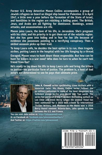 Former U.S. Army detective Mason Collins accompanies a group of Jewish refugees on board an illegal ship bound for Palestine. It is April 1947, a little over a year before the formation of the State of Israel, and hostilities in the region are reaching a boiling point. The British, Jews, and Arabs are all fighting for dominance. Bombings, armed attacks, and assassinations are rife. Mason joins Laura, the love of his life, in Jerusalem. She's pregnant with his child, and his priority is to get them out of the volatile region. But she has gone into hiding and in fear for her life because of evidence she possesses pointing to a terrifying conspiracy. Then a skilled assassin picks up their trail. To keep Laura safe, he decides the best option is to run, then tragedy strikes, putting Laura in the hospital with her life hanging by a thread. Enraged, Mason vows to hunt down those responsible. But how can he hunt for killers in a war zone? Who does he turn to when he can't tell friend from foe? He's ready to lay down his life to keep Laura safe and bring the killers to justice-his particular form of justice. The problem is, a host of bad actors are determined to see he pays that ultimate price.
