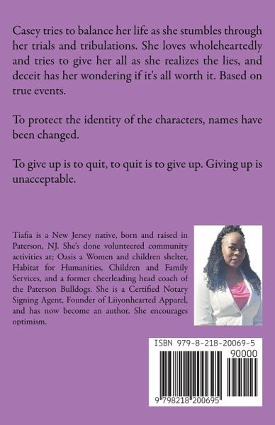 Casey tries to balance her life as she stumbles through her trials and tribulations. She loves wholeheartedly and tries to give her all as she realizes the lies, and deceit have her wondering if it's all worth it. Based on true events. To give up is to quit, to quit is to give up. Giving up is unacceptable for me. To protect the identity of the characters, the names have been changed.