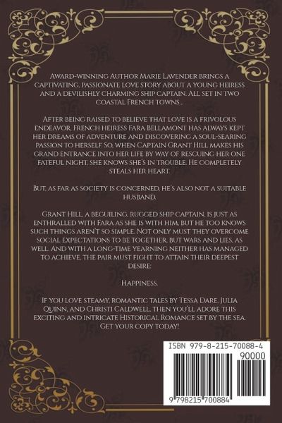 Award-winning Author Marie Lavender brings a captivating, passionate love story about a young heiress and a devilishly charming ship captain. All set in two coastal French towns… After being raised to believe that love is a frivolous endeavor, French heiress Fara Bellamont has always kept her dreams of adventure and discovering a soul-searing passion to herself. So, when Captain Grant Hill makes his grand entrance into her life by way of rescuing her one fateful night, she knows she's in trouble. He completely steals her heart. But, as far as society is concerned, he's also not a suitable husband. Grant Hill, a mysterious, rugged ship captain, is just as enthralled with Fara as she is with him, but he too knows such things aren't so simple. Not only must they overcome social expectations to be together, but wars and lies, as well. And with a long-time yearning neither has managed to achieve, the pair must fight to attain their deepest desire: Happiness. If you love steamy, romantic tales by Tessa Dare, Julia Quinn, and Christi Caldwell, then you'll adore this exciting and intricate Historical Romance set by the sea. Get your copy today!