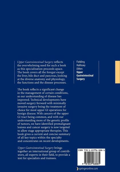 Upper Gastrointestinal Surgery forms part of the Springer Specialist Surgery Series designed to be a valuable resource for trainees and specialist alike. With information presented in a didactic manner, this useful reference guide will compliment the Springer Surgery Atlas Series, together forming a unique resource for the busy gastrointestinal surgeon. Written by an international group of contributors, all experts in their field, to provide a text for specialists and trainees, this book gives a current and concise summary of all key topics within the specialty and concentrates on recent developments.
