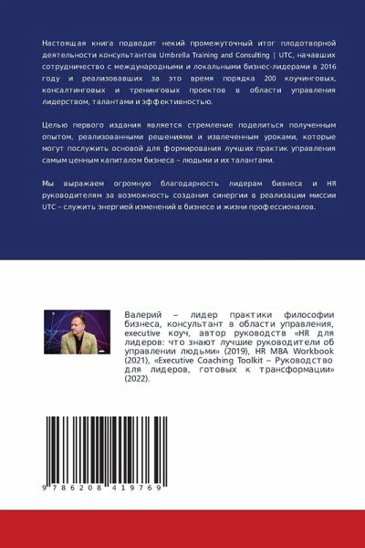 Nastoqschaq kniga podwodit nekij promezhutochnyj itog plodotwornoj deqtel'nosti konsul'tantow Umbrella Training and Consulting UTC, nachawshih sotrudnichestwo s mezhdunarodnymi i lokal'nymi biznes-liderami w 2016 godu i realizowawshih za äto wremq porqdka 200 kouchingowyh, konsaltingowyh i treningowyh proektow w oblasti uprawleniq liderstwom, talantami i äffektiwnost'ü.Cel'ü perwogo izdaniq qwlqetsq stremlenie podelit'sq poluchennym opytom, realizowannymi resheniqmi i izwlechennym urokami, kotorye mogut posluzhit' osnowoj dlq formirowaniq luchshih praktik uprawleniq samym cennym kapitalom biznesa - lüd'mi i ih talantami. My wyrazhaem ogromnuü blagodarnost' lideram biznesa i HR rukowoditelqm za wozmozhnost' sozdaniq sinergii w realizacii missii UTC - sluzhit' änergiej izmenenij w biznese i zhizni professionalow.