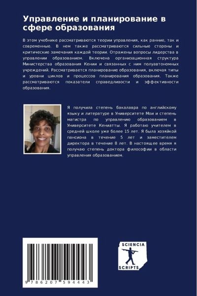 V ätom uchebnike rassmatriwaütsq teorii uprawleniq, kak rannie, tak i sowremennye. V nem takzhe rassmatriwaütsq sil'nye storony i kriticheskie zamechaniq kazhdoj teorii. Otrazheny woprosy liderstwa w uprawlenii obrazowaniem. Vklüchena organizacionnaq struktura Ministerstwa obrazowaniq Kenii i swqzannyh s nim poluawtonomnyh uchrezhdenij. Rassmatriwaetsq planirowanie obrazowaniq, wklüchaq tipy i urowni ciklow i processow planirowaniq obrazowaniq. Takzhe rassmatriwaütsq pokazateli sprawedliwosti i äffektiwnosti obrazowaniq.