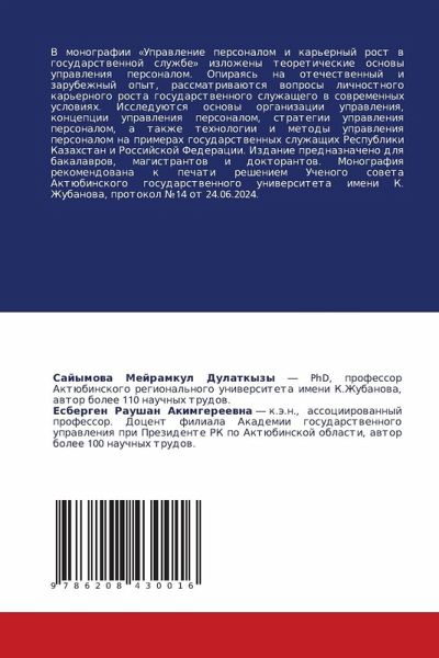 V monografii 'Uprawlenie personalom i kar'ernyj rost w gosudarstwennoj sluzhbe' izlozheny teoreticheskie osnowy uprawleniq personalom. Opiraqs' na otechestwennyj i zarubezhnyj opyt, rassmatriwaütsq woprosy lichnostnogo kar'ernogo rosta gosudarstwennogo sluzhaschego w sowremennyh uslowiqh. Issleduütsq osnowy organizacii uprawleniq, koncepcii uprawleniq personalom, strategii uprawleniq personalom, a takzhe tehnologii i metody uprawleniq personalom na primerah gosudarstwennyh sluzhaschih Respubliki Kazahstan i Rossijskoj Federacii. Izdanie prednaznacheno dlq bakalawrow, magistrantow i doktorantow. Monografiq rekomendowana k pechati resheniem Uchenogo soweta Aktübinskogo gosudarstwennogo uniwersiteta imeni K. Zhubanowa, protokol ¿14 ot 24.06.2024.