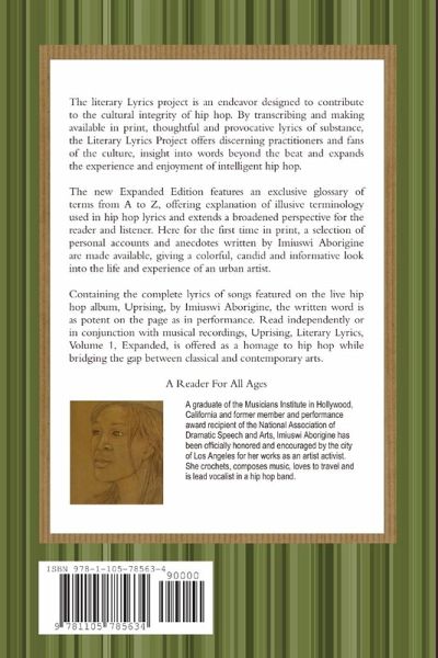 The Literary Lyrics project is an endeavor designed to contribute to the cultural integrity of hip hop. By transcribing and making available in print, thoughtful and provocative lyrics of substance, the Literary Lyrics Project offers discerning practitioners and fans of the culture, insight into the words beyond the beat and complements the experience and enjoyment of intelligent hip hop. The new Expanded Edition includes an exclusive glossary of terms from A to Z, which gives deeper meaning to illusive terminology used in hip hop lyricism and broadens the perspective for the reader and listener. The Expanded Edition also features essays and anecdotes written by Imiuswi Aborigine, giving a colorful, candid and informative view into the life of an urban artist.