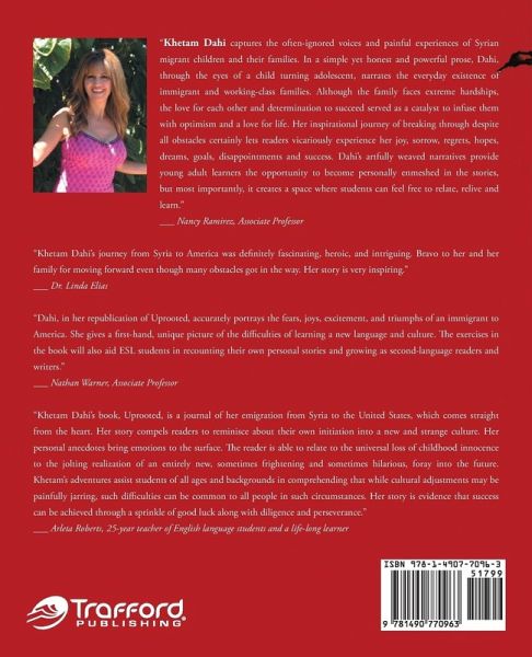 "Khetam Dahi captures the often-ignored voices and painful experiences of Syrian migrant children and their families. In a simple yet honest and powerful prose, Dahi, through the eyes of a child turning adolescent, narrates the everyday existence of immigrant and working-class families. Although the family faces extreme hardships, the love for each other and determination to succeed served as a catalyst to infuse them with optimism and a love for life. Her inspirational journey of breaking through despite all obstacles certainly lets readers vicariously experience her joy, sorrow, regrets, hopes, dreams, goals, disappointments and success. Dahi's artfully weaved narratives provide young adult learners the opportunity to become personally enmeshed in the stories, but most importantly, it creates a space where students can feel free to relate, relive and learn." ___ Nancy Ramirez, Associate Professor "Khetam Dahi's journey from Syria to America was definitely fascinating, heroic, and intriguing. Bravo to her and her family for moving forward even though many obstacles got in the way. Her story is very inspiring." ___ Dr. Linda Elias "Dahi, in her republication of Uprooted, accurately portrays the fears, joys, excitement, and triumphs of an immigrant to America. She gives a first-hand, unique picture of the difficulties of learning a new language and culture. The exercises in the book will also aid ESL students in recounting their own personal stories and growing as second-language readers and writers." ___ Nathan Warner, Associate Professor "Khetam Dahi's book, Uprooted, is a journal of her emigration from Syria to the United States, which comes straight from the heart. Her story compels readers to reminisce about their own initiation into a new and strange culture. Her personal anecdotes bring emotions to the surface. The reader is able to relate to the universal loss of childhood innocence to the jolting realization of an entirely new, sometimes frightening and sometimes hilarious, foray into the future. Khetam's adventures assist students of all ages and backgrounds in comprehending that while cultural adjustments may be painfully jarring, such difficulties can be common to all people in such circumstances. Her story is evidence that success can be achieved through a sprinkle of good luck along with diligence and perseverance." ___ Arleta Roberts, 25-year teacher of English language students and a life-long learner