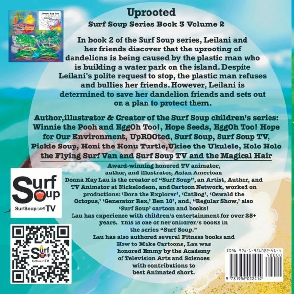 From the award-winning honored TV animator Donna Kay Lau the Surf Soup series begins! Come with us to Auntie Donna's cartoon studio. Introducing the Surf Soup series. "Uprooted" - a heartwarming tale about friendship, resilience, and compassion from the creator of the Surf Soup children's series, Donna Kay Lau. Leilani, the main character, knows all too well what it feels like to be uprooted from her home, and she is determined to prevent her friends from experiencing the same fate. But who is uprooting them, and how can she protect them? Through perseverance and grit, Leilani shows us the importance of being a loyal friend and never giving up, even in the face of adversity. In book 3 of the Surf Soup series, Uprooted?Leilani and her friends discover that the uprooting of dandelions is being caused by the plastic man who is building a water park on the island. Despite Leilani's polite request to stop, the plastic man refuses and bullies her friends. However, Leilani is determined to save her dandelion friends and sets out on a plan to protect them.As Leilani and her friends work on their plan to save the dandelions, they stumble on who is uprooting that could change everything. What does the message say, and how will it impact their mission to protect their beloved island?Here are a few more morals and lessons that can be found in the Surf Soup books?Learning to overcome fears.The importance of friendship.Appreciating nature.Being creative and imaginative.Pursuing your dreams.Friendship: The series emphasizes the importance of making new friends and working together to overcome challenges.Adventure: Each book takes readers on a new adventure with EggOh and the other characters, encouraging a sense of curiosity and exploration.Courage?Love and kindness?Perseverance?Overall, the Surf Soup book series promotes positive values and encourages readers to be curious, creative, kind, and courageous. Visit Amazon Author Page and Author Website for Teacher/Parent Reader Guide and Fun Activities