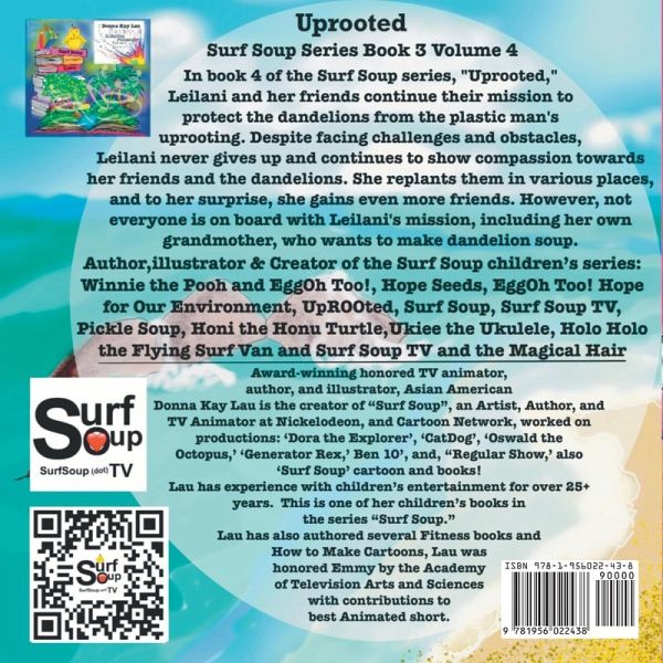 From the award-winning honored TV animator Donna Kay Lau the Surf Soup series begins! Come with us to Auntie Donna's cartoon studio. Introducing the Surf Soup series. "Uprooted" - a heartwarming tale about friendship, resilience, and compassion from the creator of the Surf Soup children's series, Donna Kay Lau. Leilani, the main character, knows all too well what it feels like to be uprooted from her home, and she is determined to prevent her friends from experiencing the same fate. But who is uprooting them, and how can she protect them? Through perseverance and grit, Leilani shows us the importance of being a loyal friend and never giving up, even in the face of adversity. In book 4 of the Surf Soup series, "Uprooted," Leilani and her friends continue their mission to protect the dandelions from the plastic man's uprooting. Despite facing challenges and obstacles, Leilani never gives up and continues to show compassion towards her friends and the dandelions. She replants them in various places, and to her surprise, she gains even more friends. However, not everyone is on board with Leilani's mission, including her own grandmother, who wants to make dandelion soup.As Leilani struggles to protect the dandelions from those who wish to harm them, she faces an unexpected challenge when her own grandmother, who she thought would support her, reveals her plans to make dandelion soup. Will Leilani be able to convince her grandmother to change her mind and see the beauty in the dandelions, or will her mission come to a halt?Here are a few more morals and lessons that can be found in the Surf Soup books?Learning to overcome fears.The importance of friendship.Appreciating nature.Being creative and imaginative.Pursuing your dreams.Friendship: The series emphasizes the importance of making new friends and working together to overcome challenges.Adventure: Each book takes readers on a new adventure with EggOh and the other characters, encouraging a sense of curiosity and exploration.Courage?Love and kindness?Perseverance?Overall, the Surf Soup book series promotes positive values and encourages readers to be curious, creative, kind, and courageous. Visit Amazon Author Page and Author Website for Teacher/Parent Reader Guide and Fun Activities