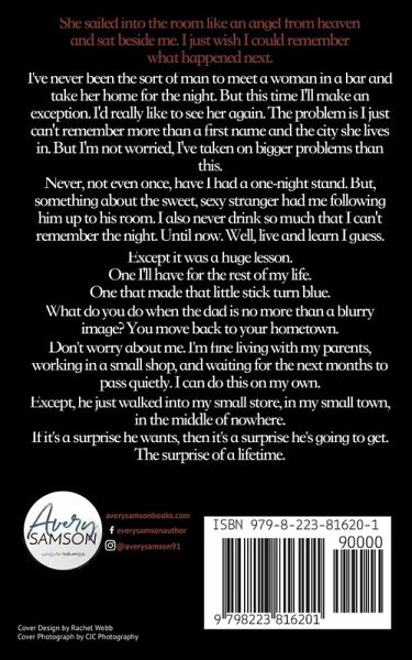 She sailed into the room like an angel from heaven and sat beside me. I just wish I could remember what happened next. I've never been the sort of man to meet a woman in a bar and take her home for the night. But this time I'll make an exception. I'd really like to see her again. The problem is I just can't remember more than a first name and the city she lives in. But I'm not worried, I've taken on bigger problems than this. Never, not even once, have I had a one-night stand. But, something about the sweet, sexy stranger had me following him up to his room. I also never drink so much that I can't remember the night. Until now. Well, live and learn I guess. Except it was a huge lesson. One I'll have for the rest of my life. One that made that little stick turn blue. What do you do when the dad is no more than a blurry image? You move back to your hometown. Don't worry about me. I'm fine living with my parents, working in a small shop, and waiting for the next months to pass quietly. I can do this on my own. Except, he just walked into my small store, in my small town, in the middle of nowhere. If it's a surprise he wants, then it's a surprise he's going to get. The surprise of a lifetime.
