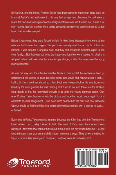 Bill Upshur, and his friend, Rodney Taylor Had been gone for more than thirty days on Marshal Taylor's last assignment,...his very last assignment. Because he had already made the decision to resign once the assignment was over. As it turned out, it was a far from routine last job, as they were taking escaped, condemned convicts back to Judge Isaac Parker to be hanged. Before it was over, they were forced to fight for their lives, because there were others who wanted to free them again. But you have already read the accounts of this last mission. It was time for a long rest now, and they both longed to be home again to see their family....But that was not to be the happy reunion they were hoping for. Upshur's adopted father had been shot by a wanted gunslinger, a killer that also stole the aging man's pet horse. As was his way, and the rules he lived by, Upshur could not let this senseless deed go unpunished. He vowed to track this killer down, and would find him whatever it took,...trailing him for more than a hundred miles. But there, he was shot for his trouble, almost killed by the very gunman he was hunting. But it would not end there, not for Upshur! Near death at first, he recovered enough to go after the young gunman again. Only now, Rodney Taylor had come into the picture and together, would once again try and complete another assignment,...one even more deadly than the previous one. Because Upshur would be facing a killer, that some believed was as fast with a gun as he was,...or faster! Every one in Paris, Texas was up in arms, because the Killer had shot the Town's most loved citizen. Doc. Bailey Helped to build the town of Paris, was there when it was surveyed, delivered the babies that would make Paris the city it had become. He had touched every man, woman and child in town in so many ways. They all were waiting for Upshur to take their revenge on this man,...as they were all his family, too!