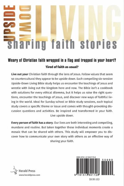 Every person of faith has a story. At times our lives are interesting and compelling, mundane and routine. Yet taken together these individual moments create a mosaic that can be shared with others. This study will empower you to discover how to communicate your own story with others as an effective way of sharing your faith. Weary of Christian faith wrapped in a flag and trapped in your heart? Tired of faith as usual? Live out your Christian faith through the lens of Jesus. Follow values that seem so counter-cultural they appear to be upside down. Each compelling six-session Upside-Down Living Bible study helps us encounter the teachings of Jesus and wrestle with living out the kingdom here and now. The Bible isn't a cookbook with solutions for every ethical dilemma, but it helps us raise the right questions, encounter the teachings of Jesus, and discover new ways of faithful living in the world. Ideal for Sunday school or Bible study sessions, each topical study covers a specific theme or issue, and comes with thought-provoking discussion questions and activities. Be inspired and transformed in your faith. Live upside down. 46 Pages.