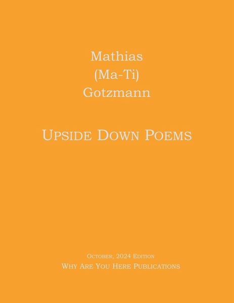 UPSIDE DOWN POEMS In the times of things that indeed are upside down (see poem 'In the Feeling', these poems can help bring back the vertical adjustment, allow life to be anchored in regained certainty of idea that are real and not a guess work. Works of Ma-Ti align very well with the objective of the Why Are You Here Publications. They help us to bring back proper verticality in the upside down world of things mechanical, horizontal or vertically reversed... - THE PUBLISHER Why Are You Here Publications is a modern publishing house promoting works that are meant to help answer the very…mehr