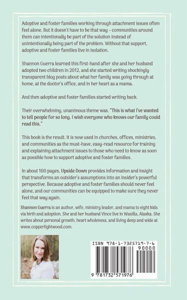 Adoptive and foster families working through attachment issues often feel alone. But it doesn't have to be that way - communities around them can intentionally be part of the solution instead of unintentionally being part of the problem. Without that support, adoptive and foster families live in isolation. Shannon Guerra learned this first-hand after she and her husband adopted two children in 2012, and she started writing shockingly transparent blog posts about what her family was going through at home, at the doctor's office, and in her heart as a mama. And then adoptive and foster families started writing back. Their overwhelming, unanimous theme was, "This is what I've wanted to tell people for so long. I wish everyone who knows our family could read this." This book is the result. It is now used in churches, offices, ministries, and communities as the must-have, easy-read resource for training and explaining attachment issues to those who need to know as soon as possible how to support adoptive and foster families. In about 100 pages, Upside Down provides information and insight that transforms an outsider's assumptions into an insider's powerful perspective. Because adoptive and foster families should never feel alone, and our communities can be equipped to make sure they never feel that way again.