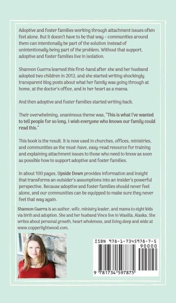 Adoptive and foster families working through attachment issues often feel alone. But it doesn't have to be that way - communities around them can intentionally be part of the solution instead of unintentionally being part of the problem. Without that support, adoptive and foster families live in isolation. Shannon Guerra learned this first-hand after she and her husband adopted two children in 2012, and she started writing shockingly transparent blog posts about what her family was going through at home, at the doctor's office, and in her heart as a mama. And then adoptive and foster families started writing back. Their overwhelming, unanimous theme was, "This is what I've wanted to tell people for so long. I wish everyone who knows our family could read this." This book is the result. It is now used in churches, offices, ministries, and communities as the must-have, easy-read resource for training and explaining attachment issues to those who need to know as soon as possible how to support adoptive and foster families. In about 100 pages, Upside Down provides information and insight that transforms an outsider's assumptions into an insider's powerful perspective. Because adoptive and foster families should never feel alone, and our communities can be equipped to make sure they never feel that way again.