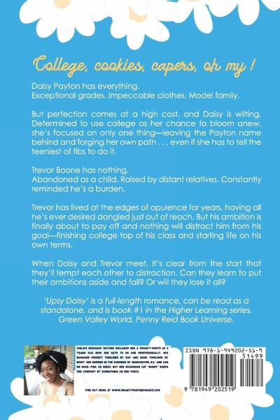 College, cookies, capers, oh my! Daisy Payton has everything. Exceptional grades. Impeccable clothes. Model family. But perfection comes at a high cost, and Daisy is wilting. Determined to use college as her chance to bloom anew, she's focused on only one thing-leaving the Payton name behind and forging her own path . . . even if she has to tell the teeniest of fibs to do it. Trevor Boone has nothing. Abandoned as a child. Raised by distant relatives. Constantly reminded he's a burden. Trevor has lived at the edges of opulence for years, having all he's ever desired dangled just out of reach. But his ambition is finally about to pay off and nothing will distract him from his goal-finishing college top of his class and starting life on his own terms. When Daisy and Trevor meet, it's clear from the start that they'll tempt each other to distraction. Can they learn to put their ambitions aside and fall? Or will they lose it all? 'Upsy Daisy' is a full-length romance, can be read as a standalone, and is book #1 in the Higher Learning series, Green Valley World, Penny Reid Book Universe.