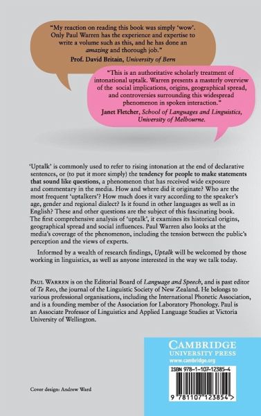 'Uptalk' is commonly used to refer to rising intonation at the end of declarative sentences, or (to put it more simply) the tendency for people to make statements that sound like questions, a phenomenon that has received wide exposure and commentary in the media. How and where did it originate? Who are the most frequent 'uptalkers'? How much does it vary according to the speaker's age, gender and regional dialect? Is it found in other languages as well as English? These and other questions are the subject of this fascinating book. The first comprehensive analysis of 'uptalk', it examines its historical origins, geographical spread and social influences. Paul Warren also looks at the media's coverage of the phenomenon, including the tension between the public's perception and the views of experts. Uptalk will be welcomed by those working in linguistics, as well as anyone interested in the way we talk today.