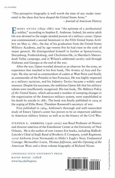 Emory Upton (1839–1881) was "the epitome of a professional soldier," according to Stephen E. Ambrose. Indeed, his entire adult life was devoted to the single-minded pursuit of a military career. Upton was commissioned a second lieutenant in the Fifth United States Artillery on May 6, 1861, the day of his graduation from the United States Military Academy, and by age twenty-five he had risen to the rank of major general. He distinguished himself in battles at Spotsylvania, Sharpsburg, Fredericksburg, and Charlottesville, in Sheridan’s Shenandoah Valley campaign, and in Wilson’s celebrated cavalry raid through Alabama and Georgia at the end of the war. After the war, Upton traveled abroad as an observer for the army, an experience that resulted in his first book, The Armies of Asia and Europe. He also served as commandant of cadets at West Point and finally as commander of the Presidio in San Francisco. He was highly respected as a military tactician, and his Infantry Tactics became a widely used resource. Despite his successes, the ambitious Upton felt that his military talents were insufficiently recognized. His last book, The Military Policy of the United States, which advocated a number of sweeping changes in the organization of the American military system, went unpublished at his death by suicide in 1881. The book was finally published in 1904 at the urging of Elihu Root, Theodore Roosevelt’s secretary of war. First published in 1964, Ambrose’s thorough and well-researched study of Emory Upton’s career has proven to be an important addition to American military history as well as to the history of the Civil War.