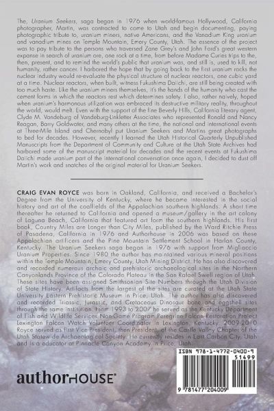 The, Uranium Seekers, saga began in 1976 when world-famous Hollywood, California photographer, Martin, was contracted to come to Utah and begin documenting, paying photographic tribute to, uranium miners, native Americans, and the Vanadium King uranium and vanadium mines on Temple Mountain, Emery County, Utah. The essence of the project was to pay tribute to the persons who traversed Zane Grey's and John Ford's great western expanse in search of uranium ore, one rock at a time, from before Madame Curies trips to the, then, present, and to remind the world's public that uranium was, and still is, used to kill, not humanity, rather cancer. I harbored the hope that by going back to the first uranium rocks the nuclear industry would re-evaluate the physical structure of nuclear reactors, one cubic yard at a time. Nuclear reactors, when built, witness Fukushima Daiichi, are still being created with too much haste. Like the uranium miners themselves, it's the hands of the humanity who cast the cement forms in which the reactors rest which determines safety. I also, rather naively, hoped when uranium's harmonous utilization was embraced its destructive military reality, throughout the world, would melt. Even with the support of the fine Beverly Hills, California literary agent, Clyde M. Vandeburg of Vandeburg-Linkletter Associates who represented Ronald and Nancy Reagan, Barry Goldwater, and many others at the time, the national and international events at Three-Mile Island and Chernobyl put Uranium Seekers and Martins great photographs to bed for decades. However, recently I learned the Utah Historical Quarterly Unpublished Manuscripts from the Department of Community and Culture at the Utah State Archives had harbored some of the manuscript material for decades and the recent events at Fukushima Daiichi made uranium part of the international conversation once again, I decided to dust off Martin's work and snatches of the original material for Uranium Seekers.