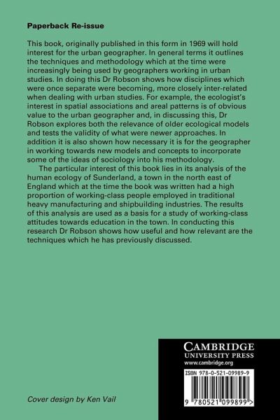 This book, originally published in 1969, will hold interest for the urban geographer. It outlines the techniques and methodology which at the time were increasingly being used by geographers working in urban studies. In doing this Dr Robson shows how disciplines which were once separate were becoming more closely interrelated when dealing with urban studies. For example, the ecologist's interest in spatial association and areal patterns is of obvious value to the urban geographer and, in discussing this, Dr Robson explores both the relevance of older ecological models and tests the validity of what were newer approaches. The particular interest of this book lies in its analysis of the human ecology of Sunderland which at the time the book was written had a high proportion of people employed in traditional heavy manufacturing and ship-building industries. The results of this analysis are used as a basis for a study of working-class attitudes towards education in the town.