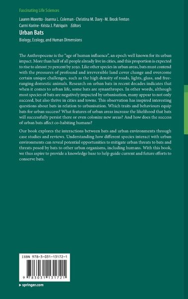 The Anthropocene is the "age of human influence", an epoch well known for its urban impact. More than half of all people already live in cities, and this proportion is expected to rise to almost 70 percent by 2050. Like other species in urban areas, bats must contend with the pressures of profound and irreversible land cover change and overcome certain unique challenges, such as the high density of roads, lights, glass, and free-ranging domestic animals. Research on urban bats in recent decades indicates that when it comes to urban life, some bats are synanthropes. In other words, although most species of bats are negatively impacted by urbanisation, many appear to not only succeed, but also thrive in cities and towns. This observation has inspired interesting questions about bats in relation to urbanisation. Which traits and behaviours equip bats for urban success? What features of urban areas increase the likelihood that bats will successfully persist there or even colonize newareas? And how does the success of urban bats affect co-habiting humans?