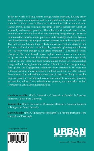 Today, the world is facing climate change, wealth inequality, housing crises, food shortages, mass migration, and now a global health pandemic. Cities are at the heart of both these problems and their solutions. Urban communication scholars are well-poised to examine the change initiatives that are both caused and inspired by such complex problems. This volume provides a collection of urban communication research focused on how examining change through the lens of communication provides unique processual understandings of cities as dynamic sites formed through the interplay between concrete cases and conceptual ideas. The first section, Change through Institutional Intervention, addresses how diverse societal institutions-including policy, regulation, planning, and voluntary arts-interplay with changes in our urban communities. The second section, Change in Place and through Space, explores various ways in which spaces and places are able to transform through communicative practice, specifically focusing on how space and place provide unique frames for communicating change and influencing interaction in cities. The third section, Change through Participation and Engagement, collectively draws attention to the ways that public participation and engagement are utilized in cities in ways that enhance the communication both within and about them, focusing specifically on how this happens globally in teaching and learning environments, community planning partnerships, industrial site redevelopment projects, and approaches to food sovereignty in urban agricultural initiatives.