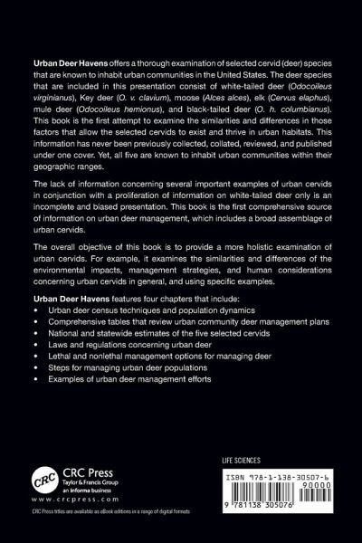 Urban Deer Havens consists of a thorough examination of selected cervid (deer) species that are known to inhabit urban communities in the United States. The deer species that are included in this presentation consisted of white-tailed (Odocoileus virginianus), Key deer (O. v. clavium), moose (Alces alces), elk (Cervus elaphus), mule (Odocoileus hemionus), and black-tailed deer (O. h. columbianus). This book is the first attempt to examine the similarities and differences in those factors that allow the selected cervids to exist and thrive in urban habitats. This information has never been collected, collated, reviewed, and published under one cover document. Yet, all five are known to inhabit urban communities within their geographic range. The lack of information concerning several important examples of urban cervids in conjunction with a proliferation of information on white-tailed deer only is an incomplete and biased presentation. This book is the first comprehensive source of information on urban deer management, which includes a broad assemblage of urban cervids. The overall objective of this book is to provide a more holistic examination of urban cervids. For example, it examines the similarities and differences of the environmental impacts, management strategies, and human dimensions considerations concerning urban cervids in general, and using specific examples. Urban Deer Havens features four chapters that include: Urban deer census techniques and population dynamics Comprehensive tables that review urban community deer management plans National and state-wide estimates the five selected cervids Laws and regulations concerning urban deer Lethal and nonlethal management options for managing deer Steps for managing urban deer populations Examples of urban deer management efforts ¿ ¿ ¿