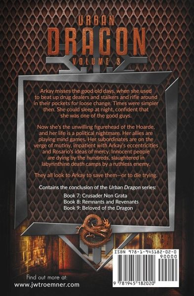 Arkay misses the good old days, when she used to beat up drug dealers and stalkers and rifle around in their pockets for loose change. Times were simpler then. She could sleep at night, confident that she was one of the good guys. Now she’s the unwilling figurehead of the Hoarde, and her life is a political nightmare. Her allies are playing mind games. Her subordinates are on the verge of mutiny, impatient with Arkay’s eccentricities and Rosario’s ideas of mercy. Innocent people are dying by the hundreds, slaughtered in labyrinthine death camps by a ruthless enemy. They all look to Arkay to save them—or to die trying. Contains the conclusion of the Urban Dragon series: Book 7: Crusader Non Grata Book 8: Remnants and Revenants Book 9: Beloved of the Dragon