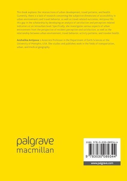 This book explores the intersections of urban development, travel patterns, and health. Currently, there is a lack of research concerning the subjective dimensions of accessibility in urban environments and travel behavior, as well as travel-related outcomes. Antipova fills this gap in the scholarship by developing an analysis of satisfaction and perception-related indicators at an intraurban level. Specifically, she investigates various aspects of urban environment from the perspective of resident perception and satisfaction, as well as the relationship between urban environment, travel behavior, activity patterns, and traveler health.
