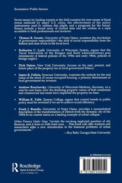 Chapter 1 Rethinking Urban Finance in America Thomas R. Swartz; Chapter 2 The Nation's Cities: Is History About to Be Repeated? Katharine C. Lyall; Chapter 3 Property Taxes: Their Past Present and Future Place in Government Finance Dick Netter; Chapter 4 The Outlook for Owner-Occupied Housing in the Year 2000 James R. Follain; Chapter 5 Are City Fiscal Crises on the Horizon? Andrew Reschovsky; Chapter 6 What Are the Limits of Government? What Are Its Obligations? William K. Tabb; Chapter 7 The City of Detroit: A Personal Perspective Frank J. Bonello;