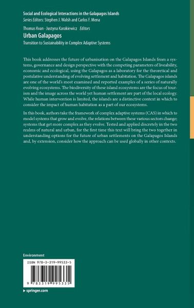 1.Complexity and consequence in coupled natural urban systems.- Section 1.The Galapagos as a living laboratory.- 2.The Galapagos Urban Context.- 3.Understanding Coupled Urban-Natural Dynamics as the Key to Sustainability: The Example of the Galapagos.- 4.Scales and Transformative Change: Transitions in the Galápagos.- Section 2.Socio-ecological models.- 5.Demographics of Change: Modelling the Transition of Fishers to Tourism in the Galapagos Islands.- 6.Socio ecological systems and the management of the natural resources in the Galapagos.- Section 3.Models of change.- 7.A Model-Based Approach to Study the Tourism Sustainability in an Island Environment: The Case of Galapagos Islands.- 8.Towards Urban Self-Sufficiency in the Galapagos Islands.- 9.Avoiding the colour grey: parametrising CAS to incorporate reactive scripting.- 10.Reflections.