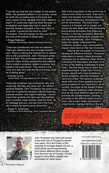 Half of the population of the world lives in cities of one million or more. If we don't reach and disciple from these masses, our future missionary and pastoral force will be diminished. The book Urban Impact is a trumpet call to muster our forces but also deals with the philosophy and practical principles that make any ministry in the city successful. Brandishing a practical writing style coupled with real life experiences, John Thompson helps the reader understand the problems, burdens, joys, and powerful impact cities have on the rest of society. Helping the city pastor or missionary develop an effective ministry, Thompson elaborates on seven critical principles necessary for an effective urban ministry. Following this discussion the book turns to two of the leading challenges of great cities. The first being how to reach the disenfranchised--those from minority groups, people who have substance abuse problems, and the homeless, to name but a few. The second challenge deals with one of the greatest foundational problems in our cities and in all of society: the plight of the Absent Father. Other chapters address urban discipleship as the most effective approach to promote life transformation, planting churches in the difficult urban environment, and a topic rarely discussed in urban books, raising a family in the city.