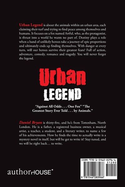 Urban Legend is about the animals within an urban area, each claiming their turf and trying to find peace among themselves and humans. It focuses on a fox named Artful, who, as the protagonist, is thrust into a world he wants no part of. Destiny plays a role when a band of unlikely heroes take a journey of epic proportions and ultimately ends up finding themselves. With danger at every turn, will our heroes survive their greatest fears? Full of action, adventure, comedy, romance and tragedy. You will never forget the legend.