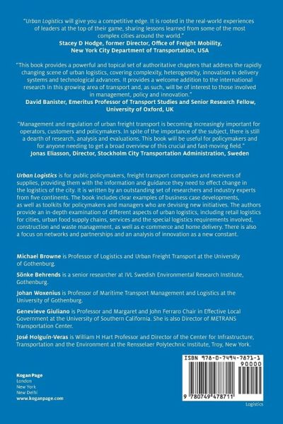 Michael Browne is Professor of Logistics and Urban Freight Transport at the University of Gothenburg. Sönke Behrends is a senior researcher at IVL Swedish Environmental Research Institute, Gothenburg. Johan Woxenius is Professor of Maritime Transport Management and Logistics at the University of Gothenburg. Genevieve Giuliano is Professor and Margaret and John Ferraro Chair in Effective Local Government at the University of Southern California. She is also Director of METRANS Transportation Center. José Holguín-Veras is William H Hart Professor and Director of the Center for Infrastructure, Transportation and the Environment at the Rensselaer Polytechnic Institute, Troy, New York.