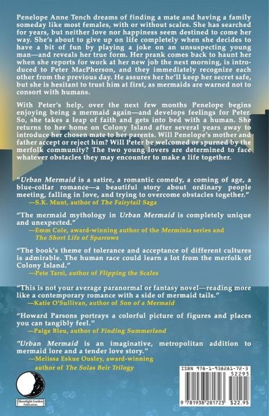 This new adult fiction fantasy novel for ages 18 and up is full of imaginative folklore and a new spin on a mermaid who is living and working with humans. Ever since Penelope Tench was in grade school, she knew there was no one living on Colony Island she was interested in choosing as a mate. There were feral boys-merfolk who lived in the ocean-but they were not a viable choice. Penelope could only spend three days at sea before wanting to return home to her warm bed and a hot meal. She wanted to find a mate and have a family someday, like most females, with or without scales, but as she grew up, her chances lessened, as there seemed to be only one option left-and mermaids were strongly advised not fall to in love with humans. After graduating with a degree in Finance, she began living a very lonely and isolated life in the city and shut out her family and friends. Even though she had a job lined up, she felt there was no future for her-anywhere. While spending a day in the ocean, Penelope lay under a dock contemplating her life. She was about to return to the city, catch a flight to the desert, and end things, when a human male walked out on the pier. Instead of hiding, she popped above the surface, gave him a scare, and then proceeded to chat with him for a bit before disappearing underwater. She'd enjoyed herself so much, she decided she would stick around a bit longer. Penelope reported for her new job the next morning, and found her temporary desk was right next to the Assistant Comptroller, Peter MacPherson. They immediately recognized each other from the previous day, and although she wanted to flee, a series of circumstances kept her at the company. Peter assured her he'd keep her secret safe, and subsequently volunteered to make her weekend swims enjoyable again by handling all the logistics-motels, meals, and safe and secure drop-offs and pick-ups. Over the next couple months, Penelope began enjoying being a mermaid again. Then, following a knock-down, drag-out debate with herself, she realized she had feelings for Peter, and decided she would go out in a blaze of glory and get into bed with a human.