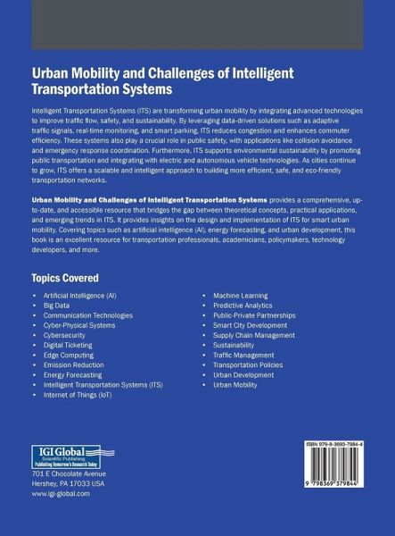 Intelligent Transportation Systems (ITS) are transforming urban mobility by integrating advanced technologies to improve traffic flow, safety, and sustainability. By leveraging data-driven solutions such as adaptive traffic signals, real-time monitoring, and smart parking, ITS reduces congestion and enhances commuter efficiency. These systems also play a crucial role in public safety, with applications like collision avoidance and emergency response coordination. Furthermore, ITS supports environmental sustainability by promoting public transportation and integrating with electric and autonomous vehicle technologies. As cities continue to grow, ITS offers a scalable and intelligent approach to building more efficient, safe, and eco-friendly transportation networks. Urban Mobility and Challenges of Intelligent Transportation Systems provides a comprehensive, up-to-date, and accessible resource that bridges the gap between theoretical concepts, practical applications, and emerging trends in ITS. It provides insights on the design and implementation of ITS for smart urban mobility. Covering topics such as artificial intelligence (AI), energy forecasting, and urban development, this book is an excellent resource for transportation professionals, academicians, policymakers, technology developers, and more.