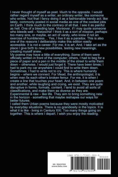 My poems may have a little of everything. Some of them were officially written in front of the computer; others, I had to beg for a piece of paper and a pen in the middle of the street to write them down - otherwise, I would just forget it. There have been times; I had to park my car anywhere I could find to write them down. Sometimes, I had to write not to cry. This is where humanity begins - where we connect. For Mead, the anthropologist, it is when men fix each other's broken femur. For me, it is when I create a line that touches your heart. And, in between one poem and another, while laughing and crying, we exist. They are quite disruptive in forms, formats, content. I tend to avoid all sorts of classifications, and make them as diverse as they are. Experimental & raw - like life. They aim to bring something new in the horizon - something that maybe reshapes our ways for better futures. I called them Urban poems because they were mostly motivated by everyday situations. I wish you enjoy the reading.