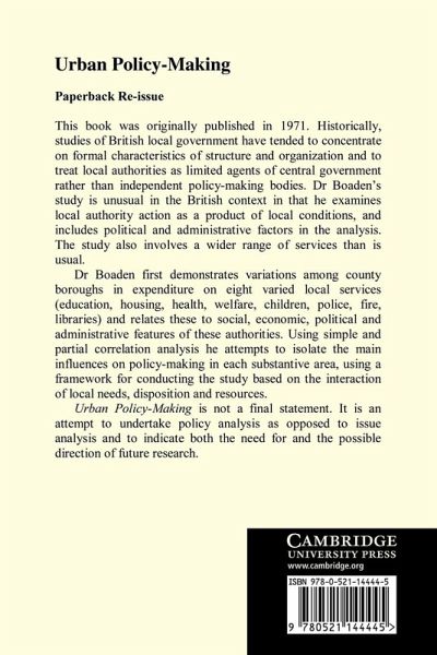 This book was originally published in 1971. Historically, studies have tended to concentrate on formal characteristics of structure and organisation and to treat local authorities as limited agents of central government rather than independent policy-making bodies. Dr Boaden's study is unusual in the British context in that he examines local authority action as a product of local conditions, and includes political and administrative factors in the analysis. Dr Boaden first demonstrates variations among county boroughs in expenditure on eight varied local services, and relates these to social, economic, political and administrative features of these authorities. Using simple and partial correlation analysis he attempts to isolate the main influences on policy-making in each substantive area, using a framework for conducting the study based on an interaction of local needs, disposition and resources. Urban Policy-Making is an attempt to undertake policy analysis as opposed to issue analysis, in order to guide research.