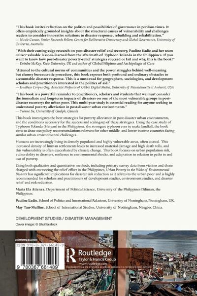This book investigates the best strategies for poverty alleviation in post-disaster urban environments, and the conditions necessary for the success and scaling up of these strategies. Using the case study of Typhoon Yolanda (Haiyan) in the Philippines, the strongest typhoon ever to make landfall, the book aims to draw out policy recommendations relevant for other middle- and lower-income countries facing similar urban environmental challenges. Humans are increasingly living in densely populated and highly vulnerable areas, often coastal. This increased density of human settlements leads to increased material damage and high death tolls, and this vulnerability is often exacerbated by climate change. This book focuses on urban population risk, vulnerability to disasters, resilience to environmental shocks, and adaptation in relation to paths in and out of poverty. Using both qualitative and quantitative methods, including primary survey data from victims and those charged with overseeing the relief effort in the Philippines, Urban Poverty in the Wake of Environmental Disaster has significant implications for disaster risk reduction as it relates to the urban poor and is highly recommended for scholars and practitioners of development studies, environment studies, and disaster relief and risk reduction.