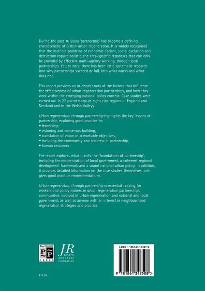 This report provides an in-depth study of factors that influence the effectiveness of urban regeneration partnerships, and how they work within the national policy context. It highlights the key lessons of partnership, exploring good practice in leadership, visioning and consensus building, and the translation of vision into workable objectives.