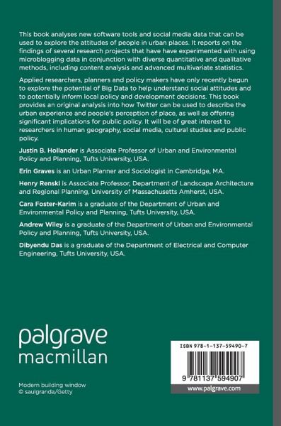Applied researchers, planners and policy makers have only recently begun to explore the potential of Big Data to help understand social attitudes and to potentially inform local policy and development decisions. This book provides an original analysis into how Twitter can be used to describe the urban experience and people's perception of place, as well as offering significant implications for public policy. It will be of great interest to researchers in human geography, social media, cultural studies and public policy.