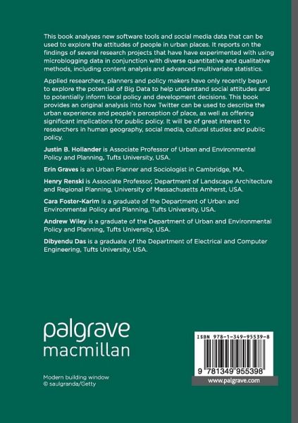 This book analyses new software tools and social media data that can be used to explore the attitudes of people in urban places. It reports on the findings of several research projects that have have experimented with using microblogging data in conjunction with diverse quantitative and qualitative methods, including content analysis and advanced multivariate statistics.