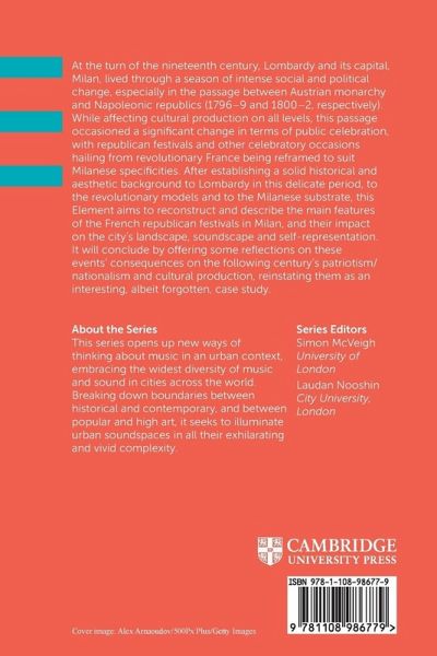 This Element aims at reconstructing and describing the main features of the French republican festivals in Milan, and their impact on the city's landscape, soundscape and self-representation. It offers some reflections on these events' consequences on the following century's patriotism/nationalism and cultural production.