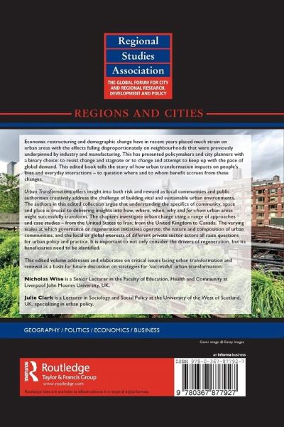 Economic restructuring and demographic change have in recent years placed much strain on urban areas with the effects falling disproportionately on neighbourhoods that were previously underpinned by industry and manufacturing. This has presented policy makers and city planners with a binary choice: to resist change and stagnate or to change and attempt to keep up with the pace of global demand. This edited book tells the story of how urban transformation impacts on people's lives and everyday interactions - to question where and to whom benefit accrues from these changes. Urban Transformations offers insight into both risk and reward as local communities and public authorities creatively address the challenge of building vital and sustainable urban environments. The authors in this edited collection argue that understanding the specifics of community, space and place is crucial to delivering insights into how, where, when, why and for whom urban areas might successfully transform. The chapters investigate urban change using a range of approaches, and case studies from the four corners of the Earth - from the United States to Iran; from the United Kingdom to Canada. The varying scales at which governance or regeneration initiatives operate, the nature and composition of urban communities, and the local or global interests of different private sector actors all raise questions for urban policy and practice. It is important to not only consider the drivers of regeneration, but its beneficiaries need to be identified. This edited volume addresses and elaborates on critical issues facing urban transformation and renewal as a basis for future discussion on strategies for 'successful' urban transformation.