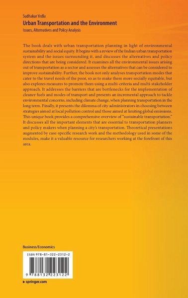 Chapter 1. Planning Transportation -The Basic Constructs.- Chapter 2. Urban Transportation Trends- An Overview.- Chapter 3. Transport Service Provision - Environmental and Other Implications.- Chapter 4. Alternative Measures and Their Assessment.- Chapter 5. Non-motorized Modes of Transport.- Chapter 6. Barrier for the Implementation of NMT and Other Cleaner Modes of Transport.- Chapter 7. Policy Analysis for Sustainability.- Chapter 8. Economic and Regulatory Measures for Environmentally Sustainable Urban Transportation.- Chapter 9. Choosing between Global Environmental Strategies Vis-à-vis Local Mitigation Strategies - Application of Multi-criteria Analysis.
