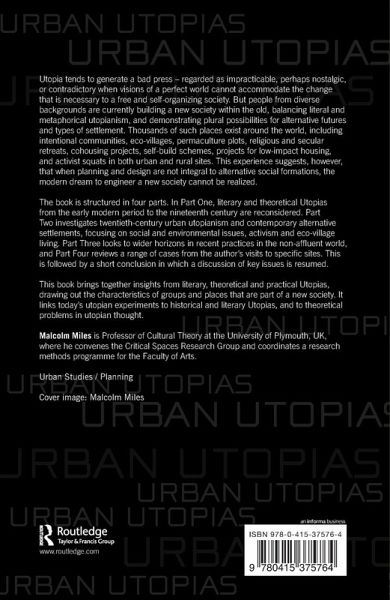 Utopia tends to generate a bad press - regarded as impracticable, perhaps nostalgic, or contradictory when visions of a perfect world cannot accommodate the change that is necessary to a free and self-organizing society. But people from diverse backgrounds are currently building a new society within the old, balancing literal and metaphorical utopianism, and demonstrating plural possibilities for alternative futures and types of settlement. Thousands of such places exist around the world, including intentional communities, eco-villages, permaculture plots, religious and secular retreats, co-housing projects, self-build schemes, projects for low-impact housing, and activist squats in urban and rural sites. This experience suggests, however, that when planning and design are not integral to alternative social formations, the modern dream to engineer a new society cannot be realized. The book is structured in four parts. In part one, literary and theoretical utopias from the early modern period to the nineteenth-century are reconsidered. Part two investigates twentieth-century urban utopianism and contemporary alternative settlements focusing on social and environmental issues, activism and eco-village living. Part three looks to wider horizons in recent practices in the non-affluent world, and Part four reviews a range of cases from the author's visits to specific sites. This is followed by a short conclusion in which a discussion of key issues is resumed. This book brings together insights from literary, theoretical and practical utopias, drawing out the characteristics of groups and places that are part of a new society. It links today's utopian experiments to historical and literary utopias, and to theoretical problems in utopian thought.