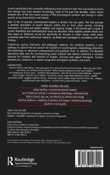 Accents and dialects are constantly undergoing small variations over time, but evidence shows that change may have become increasingly rapid in the past few decades. 'Urban Voices' presents one of the few recent surveys of this phonological variation and change in urban accents across Great Britain and Ireland. Each of the specially commissioned chapters is divided into two parts. The first provides a detailed description of accent features within one or more urban centres, including information on social and stylistic variation and ongoing change. The second discusses a range of current theoretical and methodological issues. Some chapters present wholly new data based on fieldwork carried out specifically for inclusion in 'Urban Voices', while others summarise data from well-known research, up-dated and reanalysed in accordance with new findings. Containing copious illustrative and pedagogic material, this textbook presents a clear pathway to state-of-the-art research for students of sociolinguistics, dialectology, phonetics, and phonology at advanced undergraduate and graduate level. In addition, the detailed descriptive data and the accompanying cassette constitute a valuable resource for students and teachers of English, clinicians and speech therapists, forensic phoneticians, researchers in speech recognition and speech synthesis, and actors. Contributors: Deborah Chirrey, Edge Hill University College / Beverley Collins, Rijks Universiteit Leiden, Netherlands / Gerard J Docherty, University of Newcastle, UK / Paul Foulkes, University of Leeds, UK / Nigel Hewlett, Queen Margaret College / Raymond Hickey, University of Essen, Germany / Paul Kerswill, University of Reading, UK / Anne Grethe Mathisen, University of Oslo, Norway / Kevin McCafferty, Universitetet i Tromso, Norway / Inger Mees, Copenhagen Business School, Denmark / Lesley Milroy , University of Michigan, USA / Mark Newbrook, Monash University, Australia / James M Scobbie, Queen Margaret College, UK / Jana Stoddart, Olomouc, Czech Republic / Jane Stuart-Smith, University of Glasgow, UK / Laura Tollfree, Monash University, Australia / Peter Trudgill, University of Fribourg, Switzerland / Alice Turk, University of Edinburgh, UK / Clive Upton, University of Leeds, UK / Dominic Watt, University of Leeds, UK / J D A Widdowson, University of Sheffield, UK / Ann Williams, University of Reading, UK.