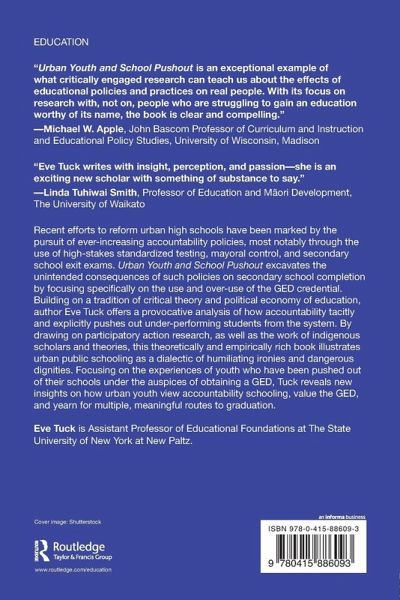 Recent efforts to reform urban high schools have been marked by the pursuit of ever-increasing accountability policies, most notably through the use of mayoral control and secondary school exit exams. This innovative and provocative volume excavates the unintended consequences of such policies on secondary school completion by focusing specifically on the use and over-use of the GED credential. Building on a tradition of critical theory and political economy of education, author Eve Tuck offers a provacative analysis of how accountability tacitly and explicitly push-out under-performing students from the system. A theoretically and empirically rich treatise on school push-out, Urban Youth and School Push-Out illustrates urban public schooling as a dialectic of humiliating ironies and dangerous dignities. Focusing on the experiences of youth who have been pushed-out of their schools under the auspices of obtaining a GED, Tuck reveals new insights on how urban youth view accountability schooling, value the GED, and yearn for multiple, meaningful routes to graduation.