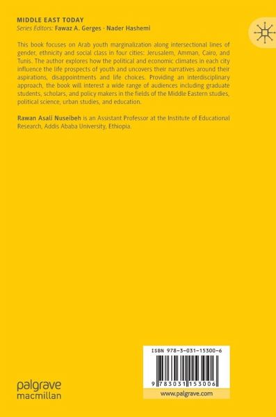 This book focuses on Arab youth marginalization along intersectional lines of gender, ethnicity and social class in four cities: Jerusalem, Amman, Cairo, and Tunis. The author explores how the political and economic climates in each city influence the life prospects of youth and uncovers their narratives around their aspirations, disappointments and life choices. Providing an interdisciplinary approach, the project will interest a wide range of audiences including graduate students, scholars, and policy makers in the fields of the Middle Eastern studies, political science, urban studies, and education.