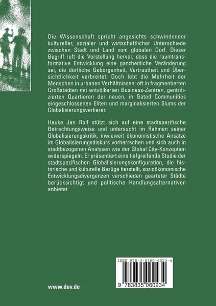 Hauke Jan Rolf stützt sich auf eine stadtspezifische Betrachtungsweise und untersucht im Rahmen seiner Globalisierungskritik, inwieweit ökonomistische Ansätze im Globalisierungsdiskurs vorherrschen und sich auch in stadtbezogenen Analysen wie der Global City-Konzeption widerspiegeln. Er präsentiert eine tiefgreifende Studie der stadtspezifischen Globalisierungskonfiguration, die historische und kulturelle Bezüge herstellt, sozioökonomische Entwicklungsdivergenzen verschieden gearteter Städte berücksichtigt und politische Handlungsalternativen anbietet.