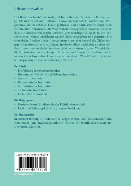 Der Band beschreibt und analysiert Innovation im Bereich der Kommunalpolitik in Deutschland. Urbane Innovation beinhaltet Projekte und Programme, die bestehende lokalpolitische Strukturen und Prozesse zu verändern versuchen. Dabei konzentriert sich der Fokus auf urbane Projekte, politische und administrative Strukturen. Die Wertfreiheit des Begriffs Innovation bedeutet, dass die Analyse von ergebnisoffenen Veränderungen ausgeht. In den verschiedenen Innovationsfeldern werden Ziele vorgegeben und definiert. Die empirische Analyse dieser Innovationen muss aber sowohl die Zielsetzungen diskutieren als auch aufzeigen, inwieweit diese nachhaltig erreicht werden. Innovation beinhaltet insofern nicht per se einen urbanen Wandel. Erst die Ex Post-Analyse von Output, Outcome und Impact kann diesen nachweisen.
