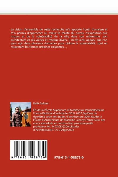 La vision d'ensemble de cette recherche m'a apporté l'outil d'analyse et m'a permis d'approcher au mieux la réalité du niveau d'exposition aux risques et de la vulnérabilité de la ville dans son urbanisme, son architecture et ses voiries et réseaux divers. Il m'est ainsi apparu que l'on peut agir dans plusieurs domaines pour réduire la vulnérabilité, tout en respectant les formes urbaines existantes....